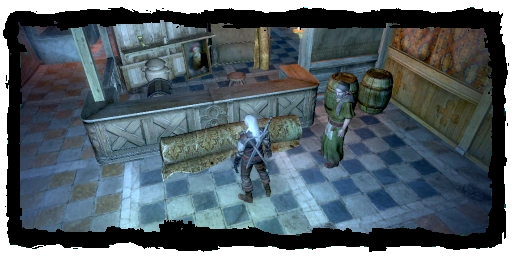For all of Chapter II, Thaler can be found in his house, which doubles as his shop, in the south-eastern section of the Συνοικία του Ναού, just around the corner from the dungeon. There he can be called upon to buy and sell a variety of goods. He also plays dice and offers a quiet drinking atmosphere and a free place to stay.